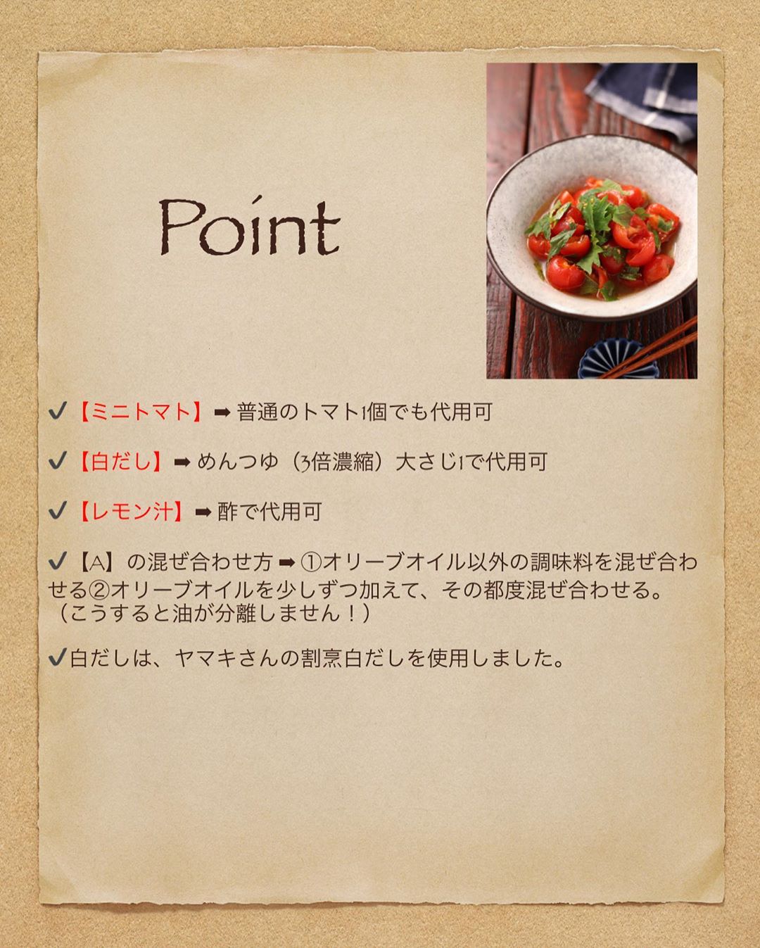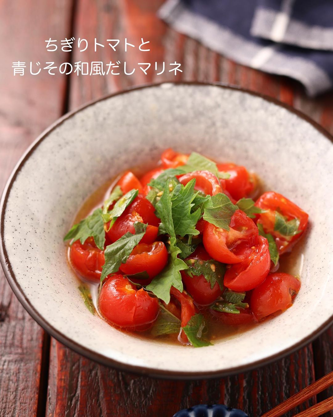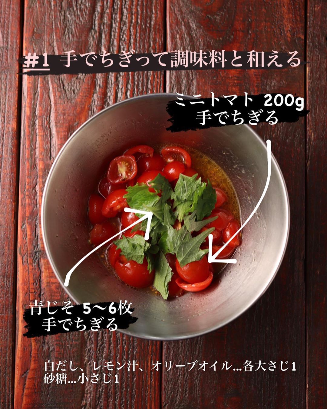 ❶ボウルに【A】を合わせ、手でちぎったミニトマト・青じそを加えて混ぜ合わせる。