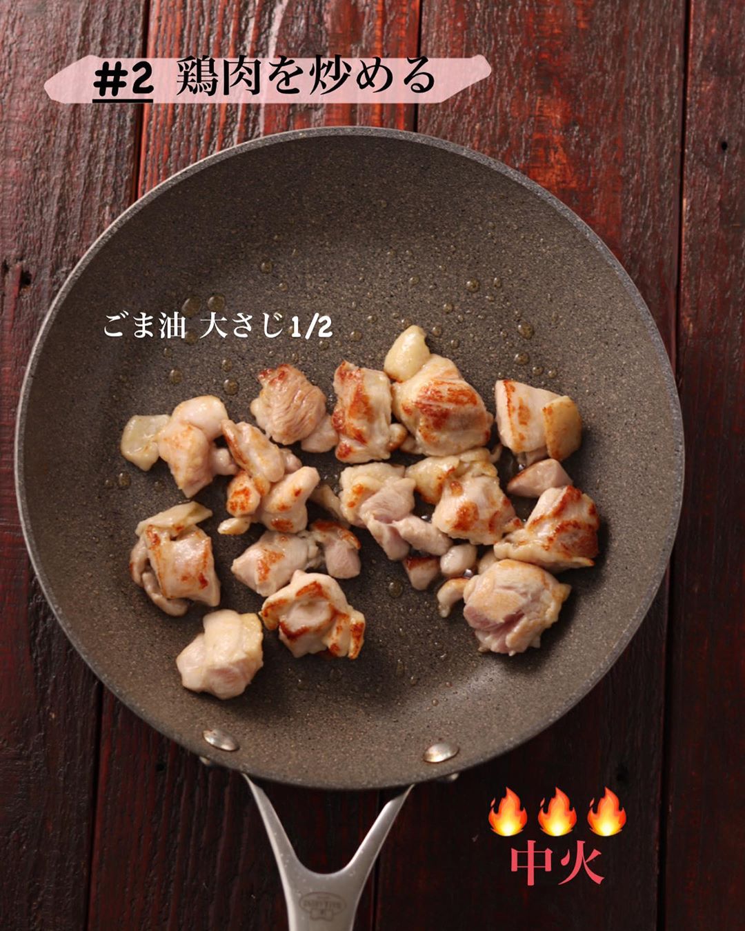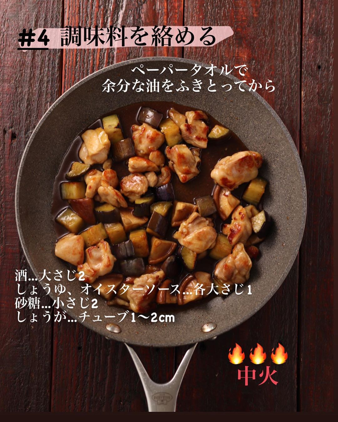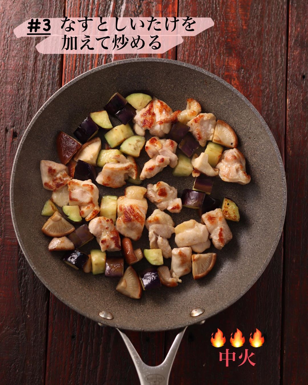 ❷フライパンにごま油を中火で熱し、鶏肉を炒める。鶏肉の色が変わったら、なすとしいたけを加えてさらに炒める。