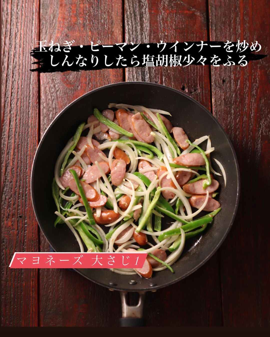 ❷フライパンにキユーピー マヨネーズを入れて中火にかけ、周りがふつふつしてきたら、玉ねぎ・ピーマン・ウインナーを入れて炒める。しんなりしたら、塩・こしょうをふる。