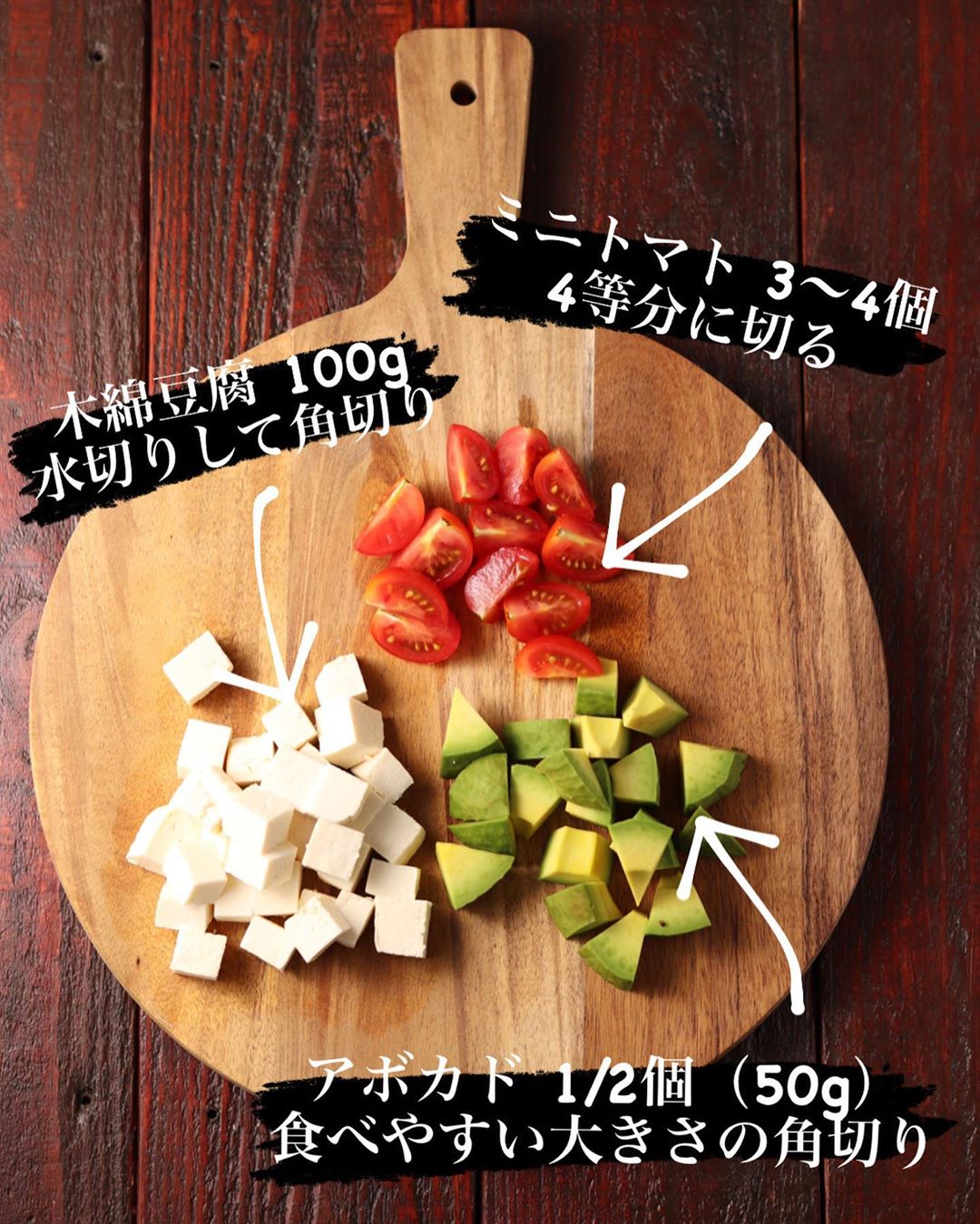 ❶アボカドは食べやすい大きさの角切りにする。木綿豆腐は水切り(※ポイント参照)をし、食べやすい大きさの角切りにする。ミニトマトは4等分にする。