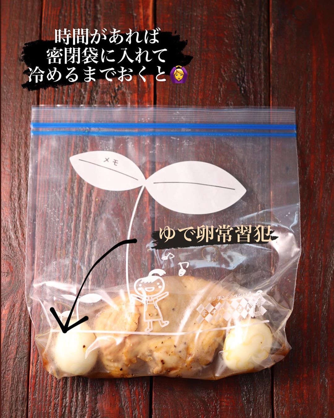 ❷時間があれば、ジップロックなどの密閉袋に汁ごと入れて冷めるまでおくと、より味が染み込みます。一緒にゆで卵を漬けるのもオススメ!切ってから漬け込むと、さらに早く味が染み込みます。(漬け込む時間がない方は、タレを絡めながら食べると◎。 )