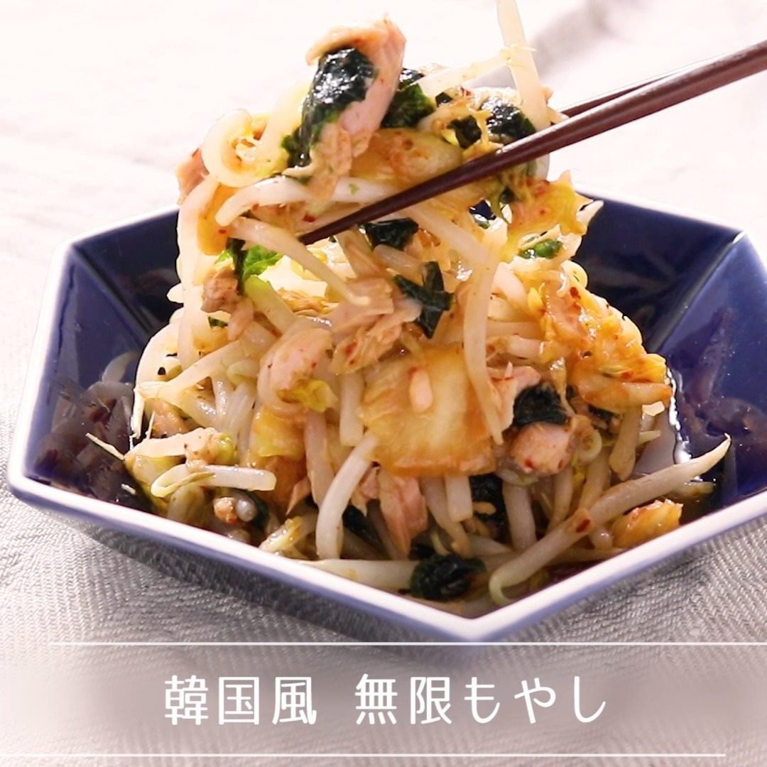 もやしの大量消費レシピ、韓国風の無限もやしの紹介です。レンジで簡単にできるので、とってもお手軽ですよ。キムチがピリッと辛くやみつきになる一品です。おつまみにもぴったりなので、ぜひ作ってみてくださいね。※『ダシダ』は「シージェイ チェイルジェダン コーポレーション」の登録商標又は商標です。