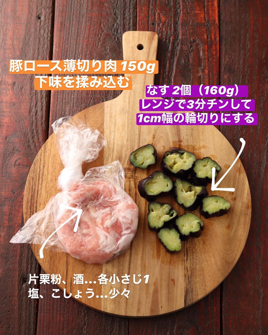 ❶豚ロース薄切り肉(しゃぶしゃぶ用)は【A】を揉み込む。なすは1個ずつラップで包み、電子レンジ(600W)で3分ほど加熱したらラップごと冷水に取る。粗熱が取れたら、1cm幅の輪切りにする。