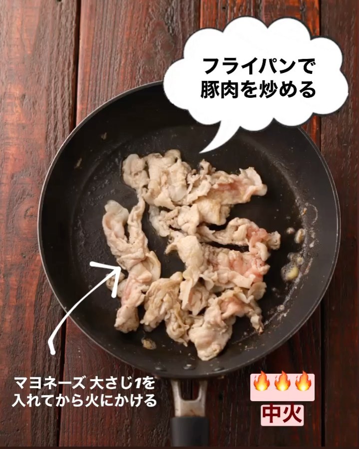 ❷フライパンにキユーピー マヨネーズを入れて中火にかける。ふつふつしてきたら豚肉を加えて炒める。豚肉の色が変わったら、なすと【B】を加えて炒め合わせる。