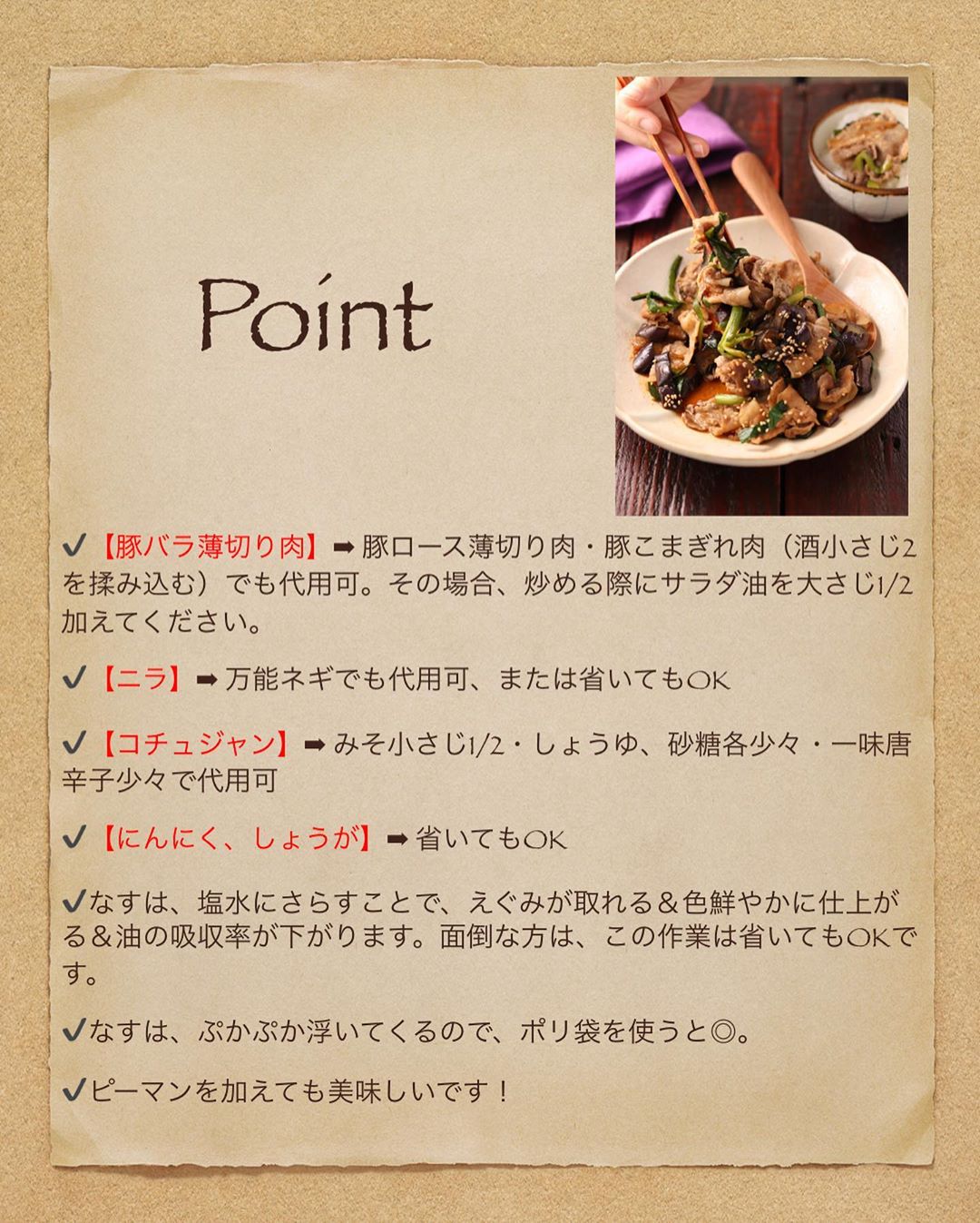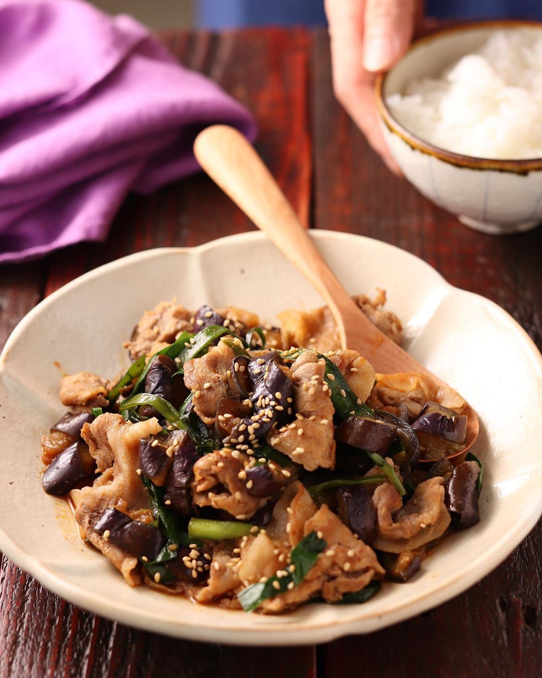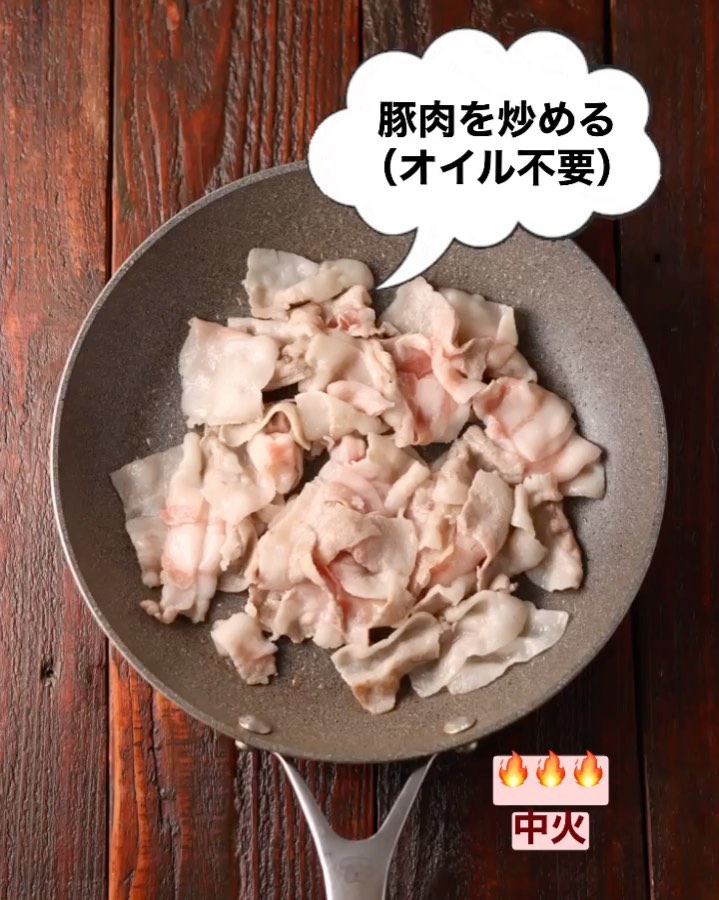 ❷フライパンを中火で熱し、豚肉を炒める(オイル不要)。豚肉の色が変わったら、水気を切ったなすを加えてサッと炒める。全体に油が絡んだら、蓋をして2〜3分蒸し焼きにする。