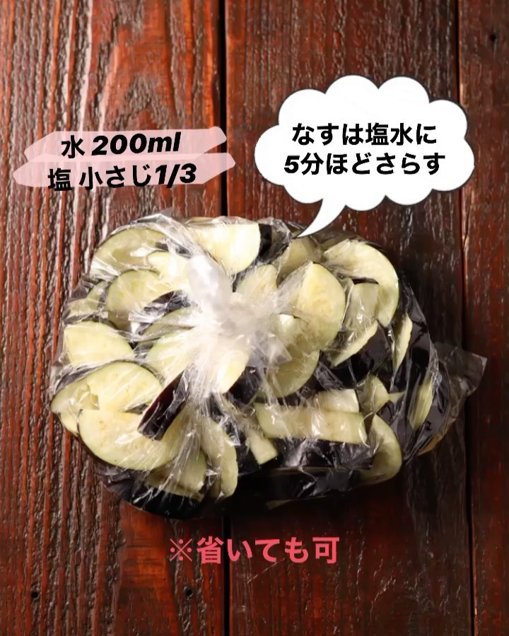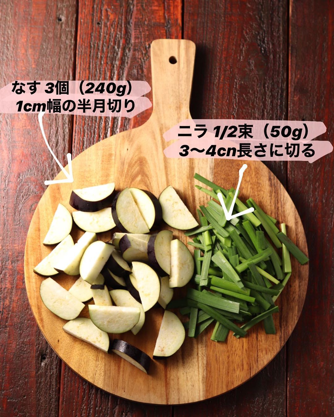 ❶なすは1cm幅の半月切りにし、塩水(水200ml・塩小さじ1/3)に5分ほどさらす。ニラは3〜4cm長さに切る。