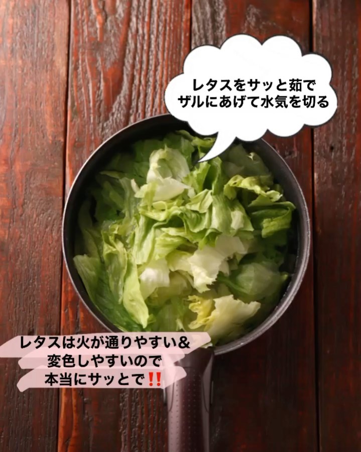 ❷鍋にたっぷりのお湯を沸騰させ、レタスを加えてサッと煮たらすぐにザルにあげて水気を切る。