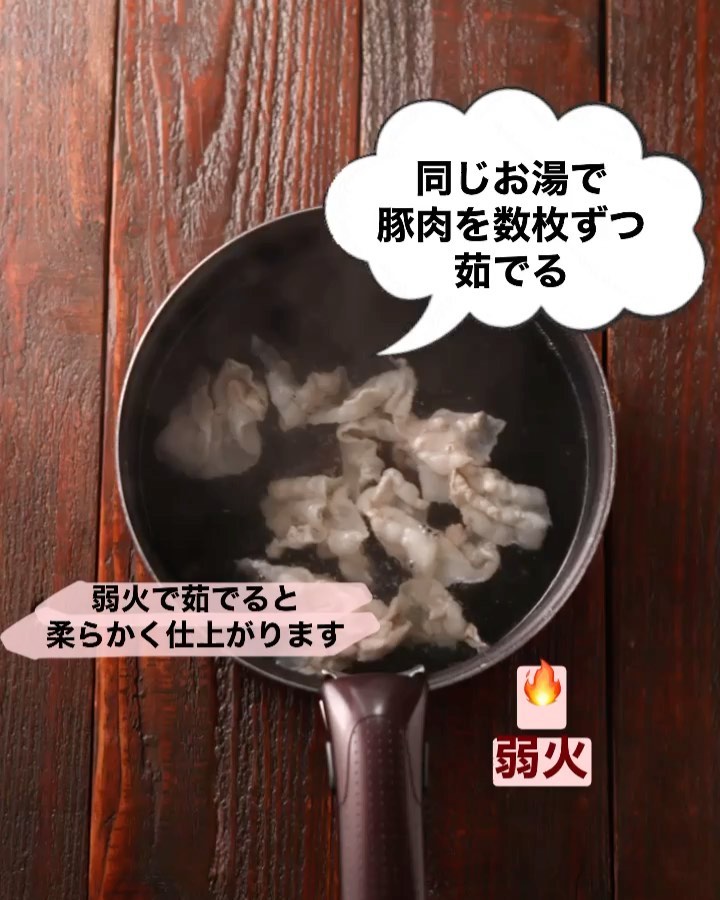 ❸弱火にし、豚肉を数枚ずつ加えてしゃぶしゃぶする。色が変わったらザルに取り出して水気を切る。