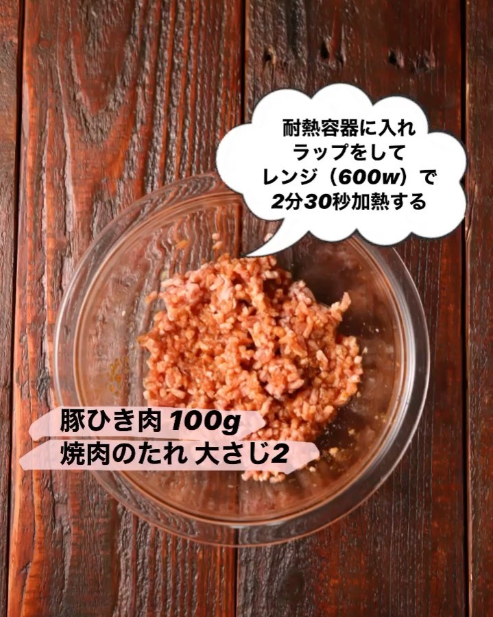 ❷耐熱容器に、合挽き肉・焼肉のたれを加えてザッと混ぜ、ふんわりラップをする。電子レンジ(600w)で2分30秒ほど加熱し、取り出してよく混ぜ肉味噌を作る。