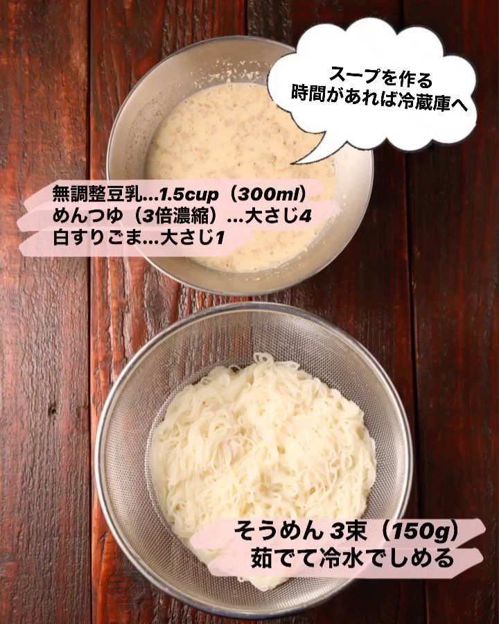 ❶そうめんは、袋の表示通り茹でて冷水で締める。【A】は合わせ、時間があれば冷蔵庫で冷やしておく。