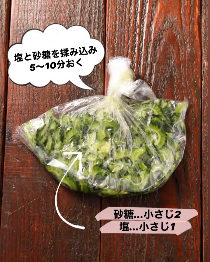 ゴーヤは塩と砂糖を揉み込み
