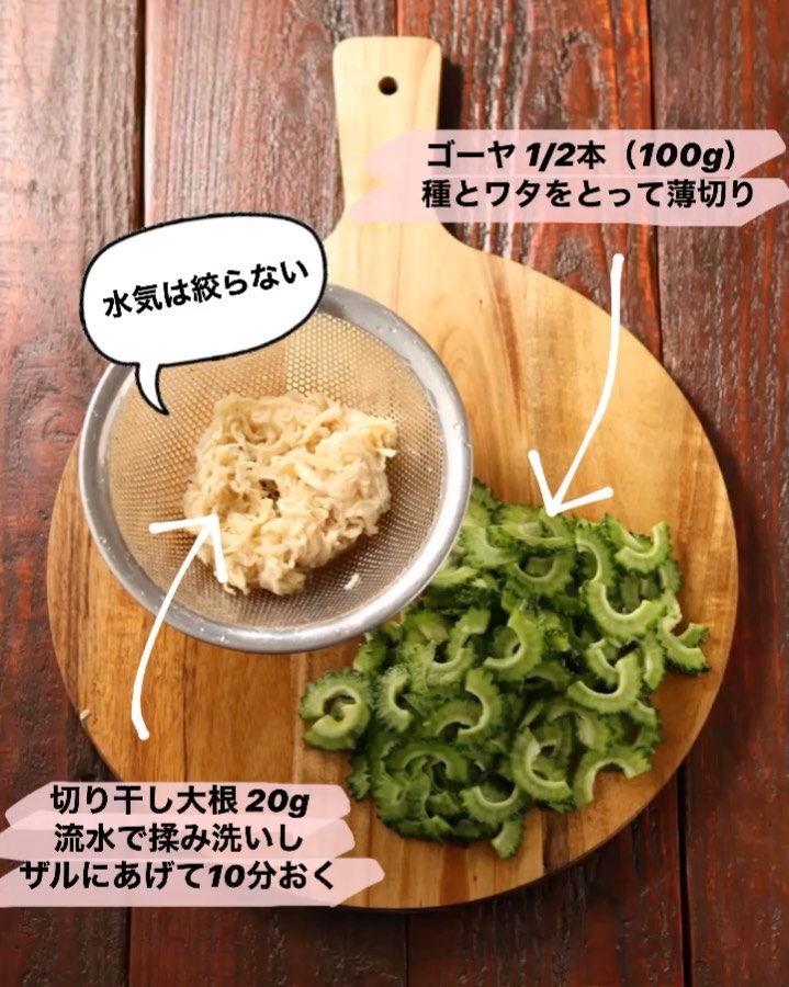 ❶ゴーヤは縦半分に切って種とワタを取る(スプーンなどで取ると◎)。薄切りにして【A】を揉み込み、5〜10分ほどおいて水洗いする。切り干し大根は流水でもみ洗いし、ザルにあげて10分ほどおく(水気は絞らない)。