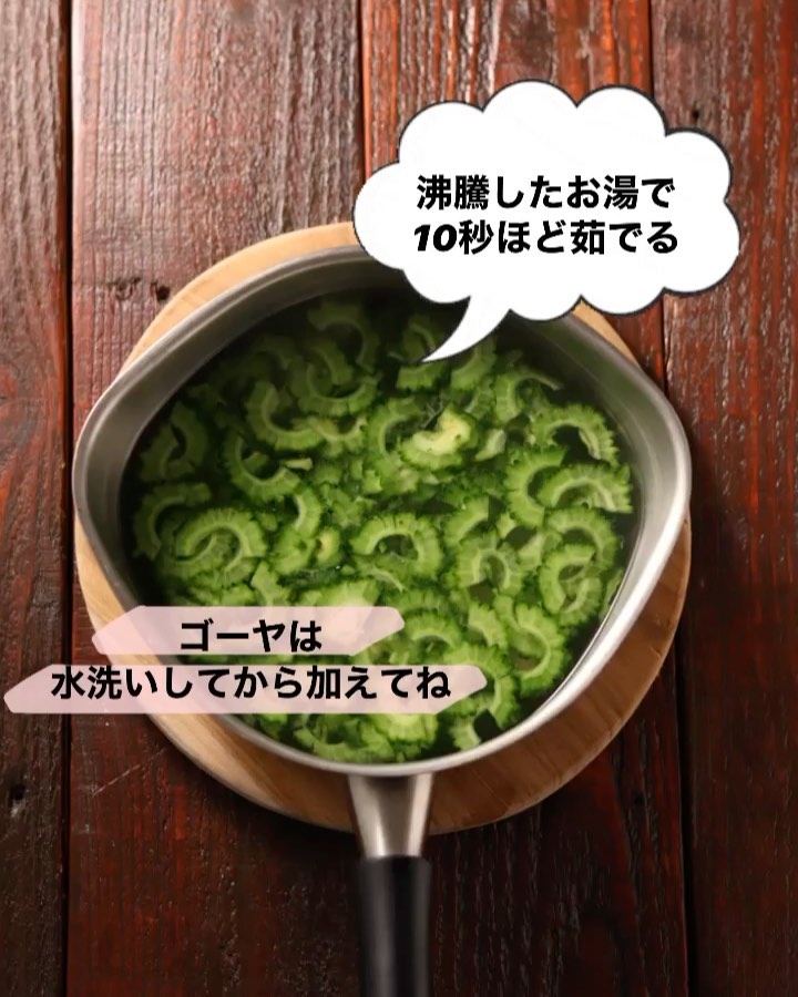 ❷鍋にたっぷりのお湯を沸騰させる。ゴーヤを加えてサッと茹で(10秒ほど)、ザルにあげて水気を切る。