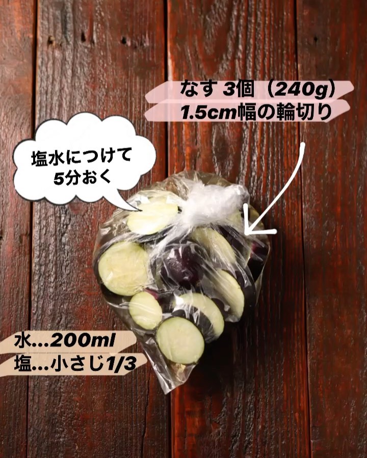 ❶なすは1.5cm幅の輪切りにし、【A】にさらして5分ほどおき、ペーパータオルでしっかり水気を拭く。(なすは浮きやすいので、ポリ袋で行うと◎)