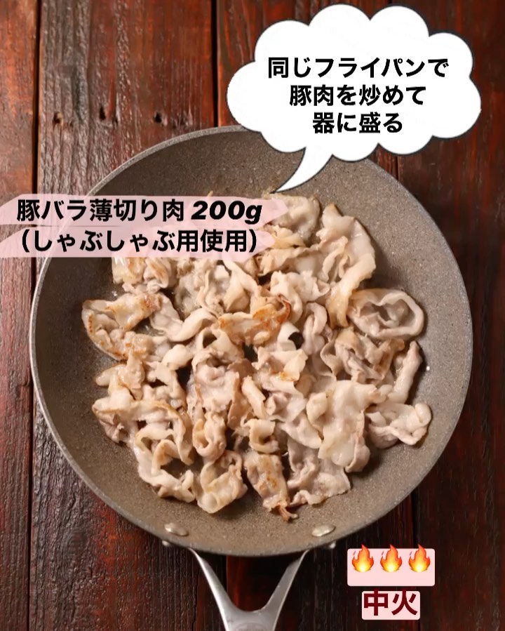 ❸同じフライパンで豚肉を炒める。全体の色が変わったら、2の器に盛る(なすの上に乗せる感じで)。合わせた【B】をかける。