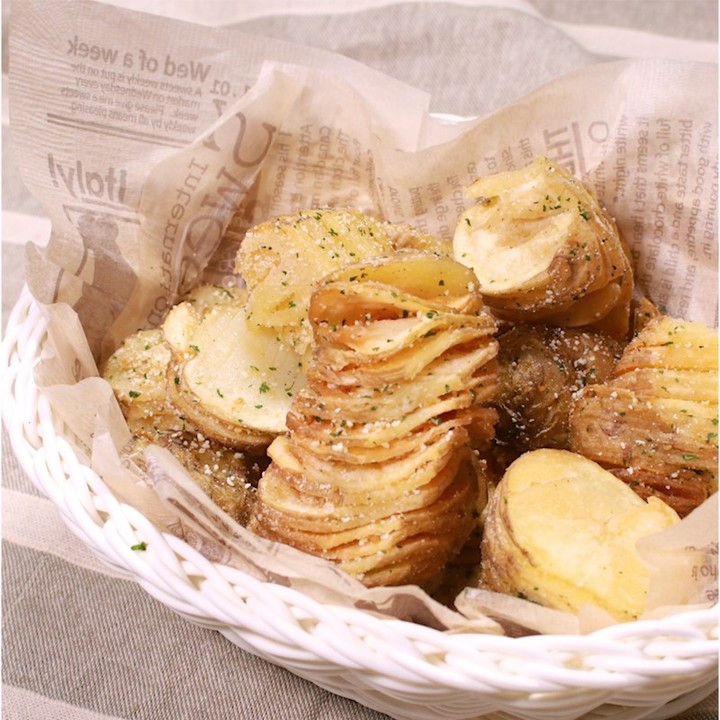 じゃがいもに、じゃばら状に切り込みを入れた見た目も楽しいフライドポテトです。味は王道のコンソメチーズ味で、子供も大人もやみつき!パーティーなどでも大活躍です。じゃがいもの大量消費にもオススメですよ、ぜひ作ってみてくださいね。