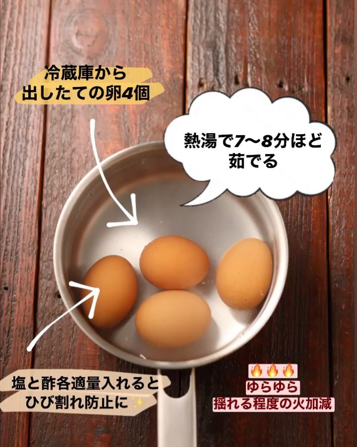 ❶鍋にたっぷりのお湯を沸騰させ、酢と塩各適量(共に分量外)を入れる。冷蔵庫から出したての卵を入れ、ゆらゆら揺れる程度の火加減(中火ぐらい)で7〜8分茹で、冷水にとって殻をむく。