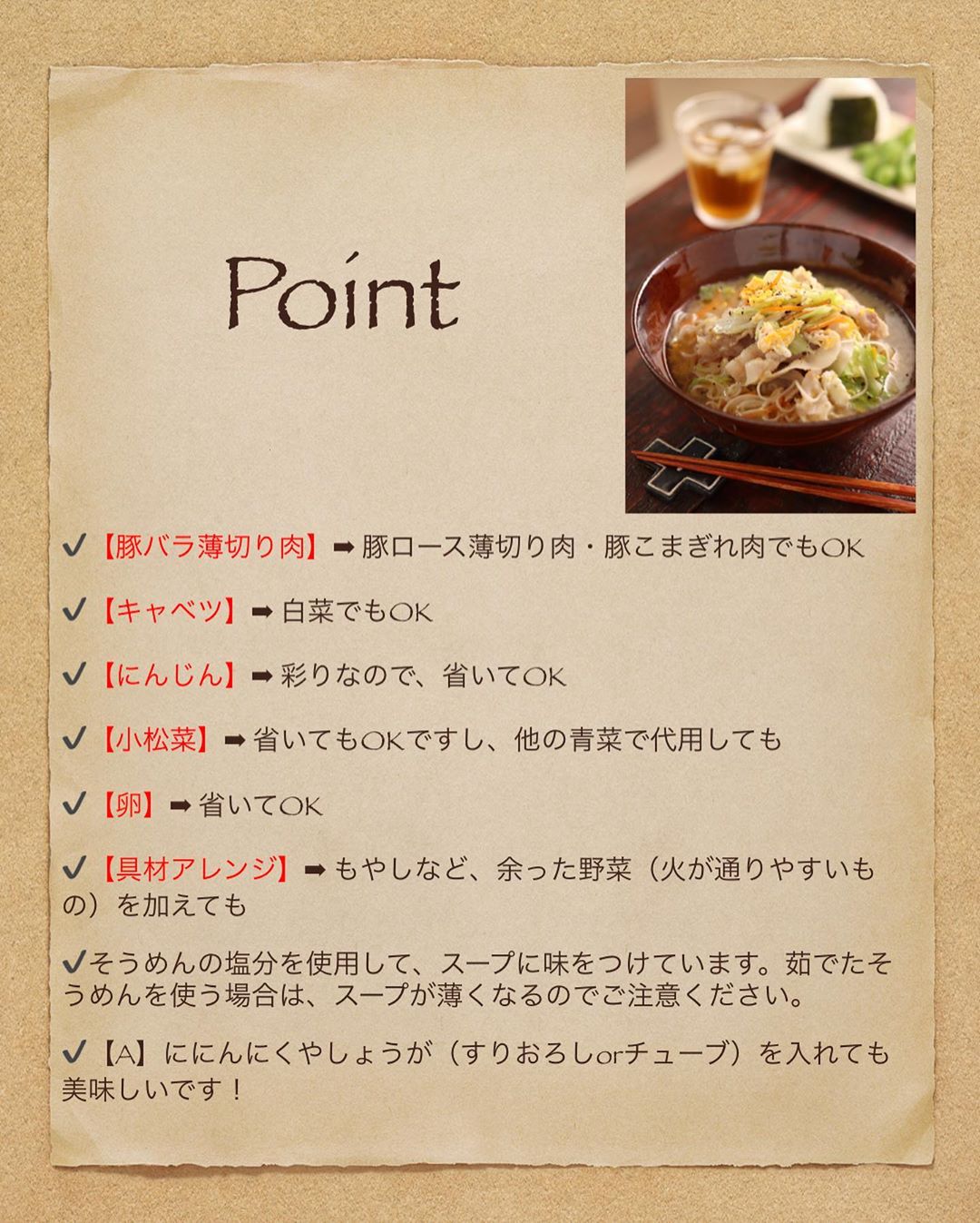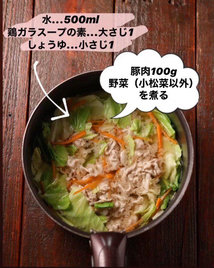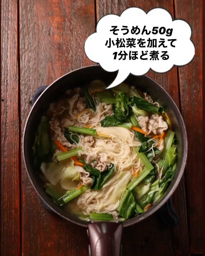 ❷鍋に【A】を入れて強火にかけ、沸騰したら中火にし、豚肉・キャベツ・にんじんを入れて煮る。豚肉の色が変わったらアクを取り、そうめん(乾燥のまま)・小松菜を加えて1〜1分30秒ほど煮る。