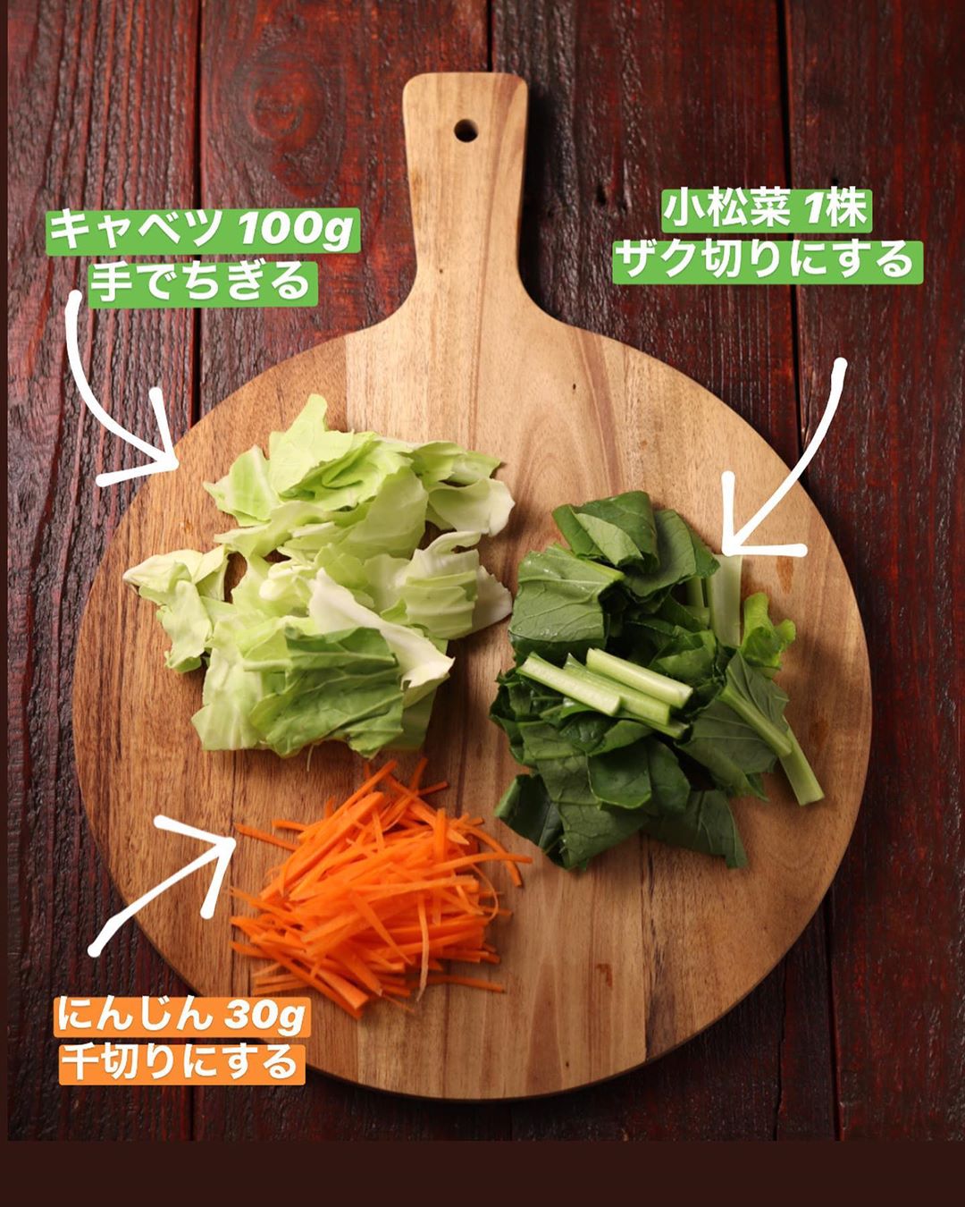 ❶キャベツは手でちぎる。にんじんは千切りに、小松菜は3〜4cm長さに切る。