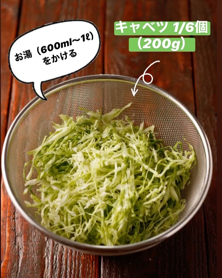 ❶キャベツは千切りにしてザルに入れ、熱湯を(600ml〜1ℓぐらい)回しかける。