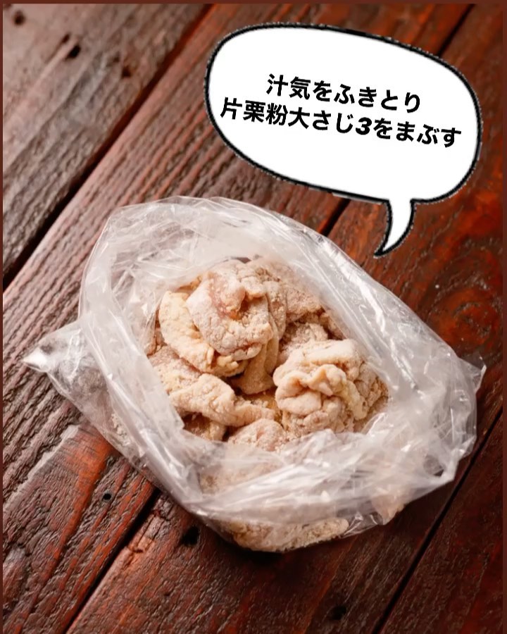 ❷ポリ袋に1・【A】を入れてよく揉み込み、10分ほどおく。ペーパータオルで余分な汁気を拭き取り、片栗粉をまぶす(新しいポリ袋またはバットに取り出してまぶして♪)。