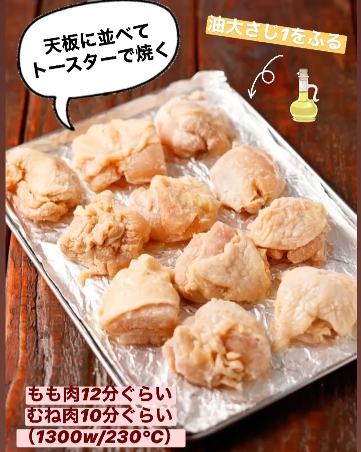 ❸天板にアルミホイルを敷き、2の皮目を上にして並べる。サラダ油をまわしかけ、オーブントースター(1300w・温度設定ができるなら230度)で12分ほど(むね肉は10分ほど)焼く。