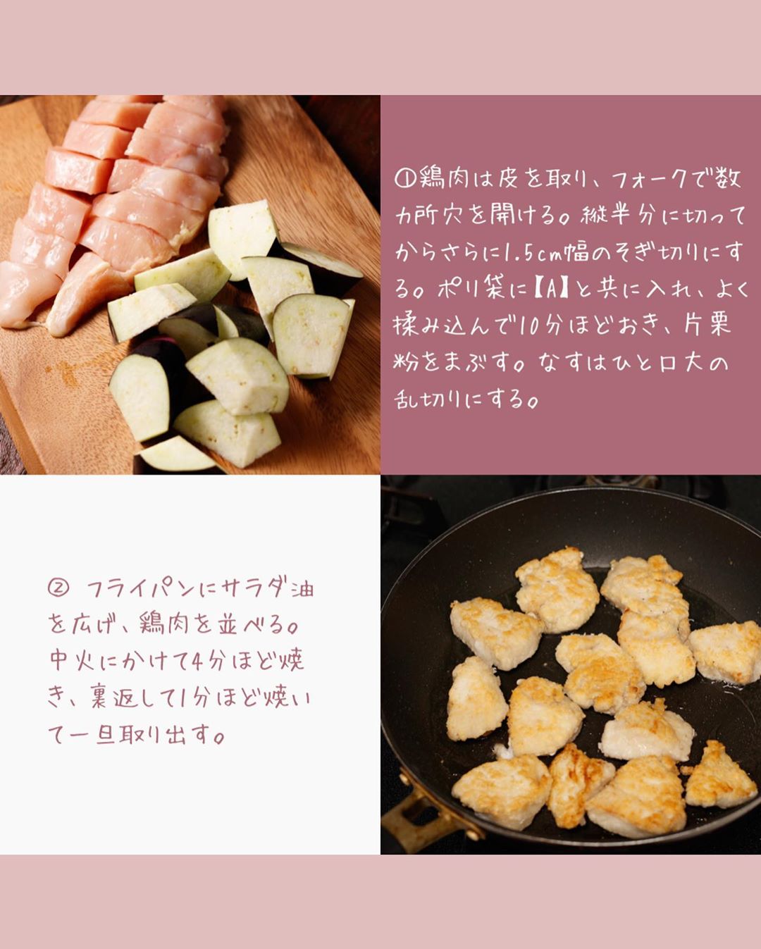 ❶鶏肉は皮を取り、フォークで数カ所穴を開ける。縦半分に切ってからさらに1.5cm幅のそぎ切りにする。ポリ袋に【A】と共に入れ、よく揉み込んで10分ほどおき、片栗粉をまぶす。なすはひと口大の乱切りにする。