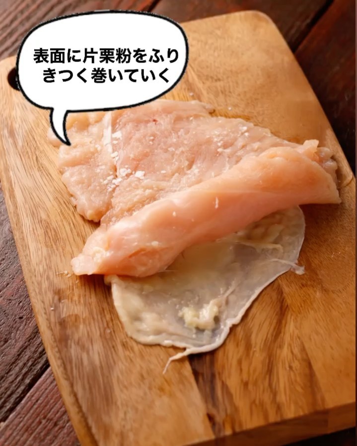❷①の表面(皮のない方)に片栗粉をふり、手前から奥に向かってきつく巻く(このとき、皮を半分はがしておいて、最後に巻き終わりにかぶせる、爪楊枝で2〜3か所留める。