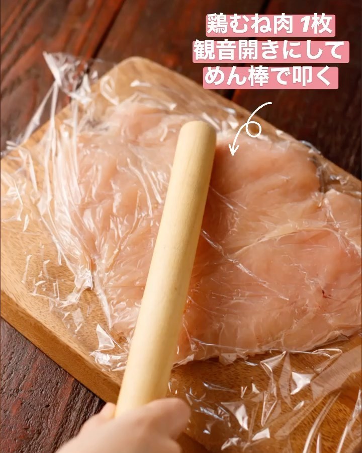 ❶鶏肉は皮目にフォークで数カ所穴を開け、観音開きにする。ラップをかぶせ、めん棒などでたたいて薄く広げる。