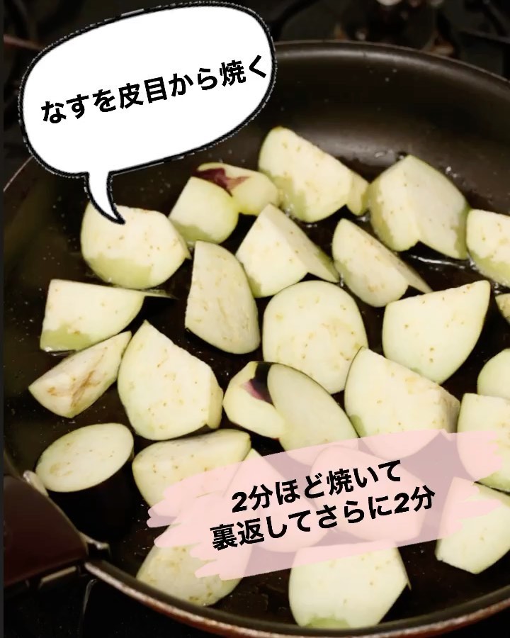 ❸フライパンにごま油を広げ、2を並べる。4分ほど焼いて裏返し、もう片面も1分ほど焼いていったん取り出す。続いて、なすの皮目を下にして並べ(油が足りない場合は、足してください♪)、2分ほど焼いて裏返し、さらに2分ほど焼いて取り出す。