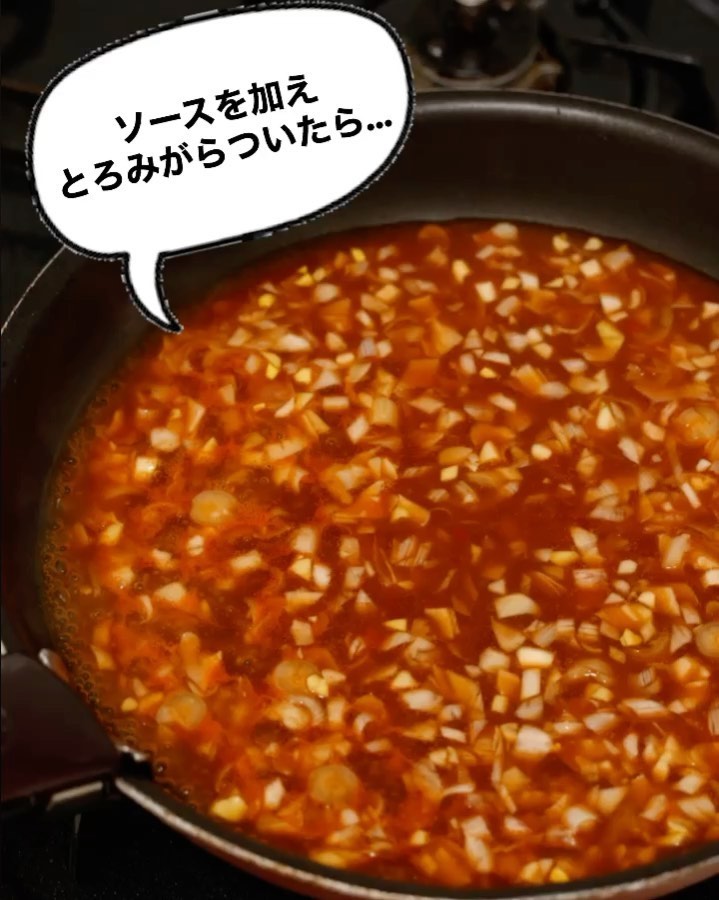 ❹フライパンに【B】を加え(油が気になる場合は、ペーパータオルなどで拭き取って♪)、とろみがついたら3を戻し入れて絡める。
