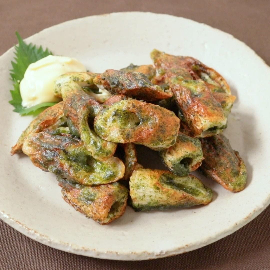 4. 大葉を敷いたお皿に盛り付け、マヨネーズを添えて完成です。