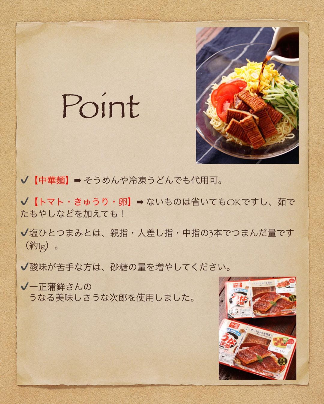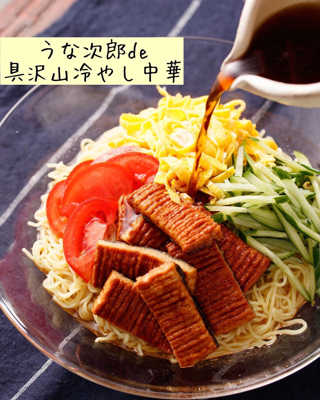 2️⃣器に中華麺を盛り、薄焼き卵・きゅうり・トマト・うな次郎をトッピングし、合わせた【A】をかける。
