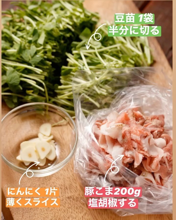 1️⃣豚肉は塩・こしょうを揉み込む。豆苗は根元を切って長さを半分に切る。にんにくは薄切りにする。
