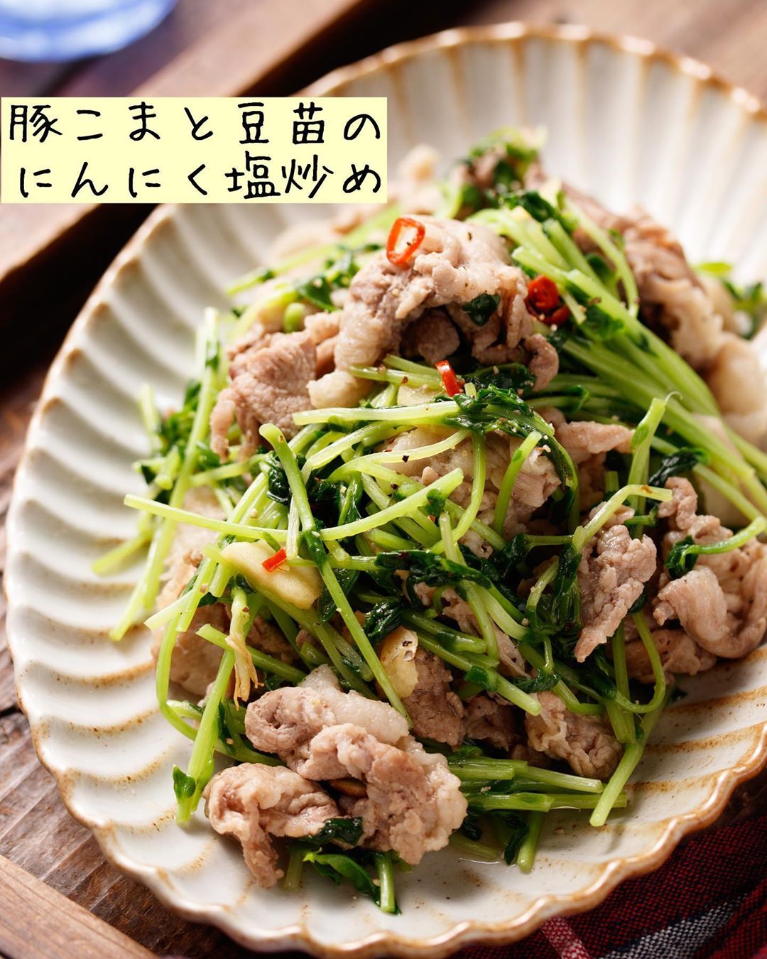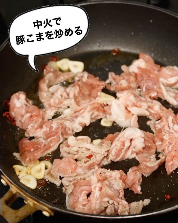 #豚こまと豆苗のにんにく塩炒め
