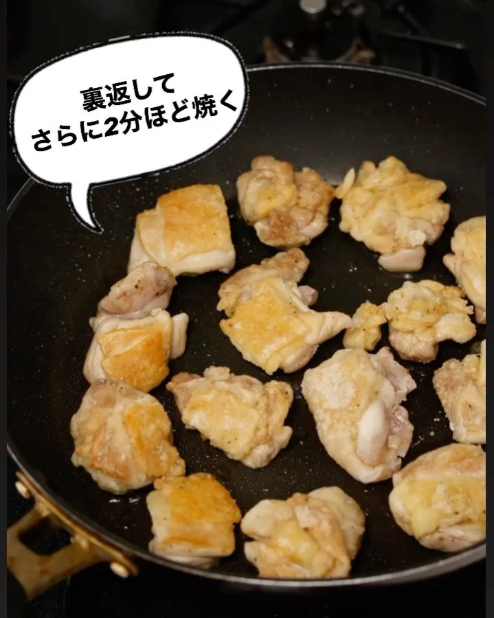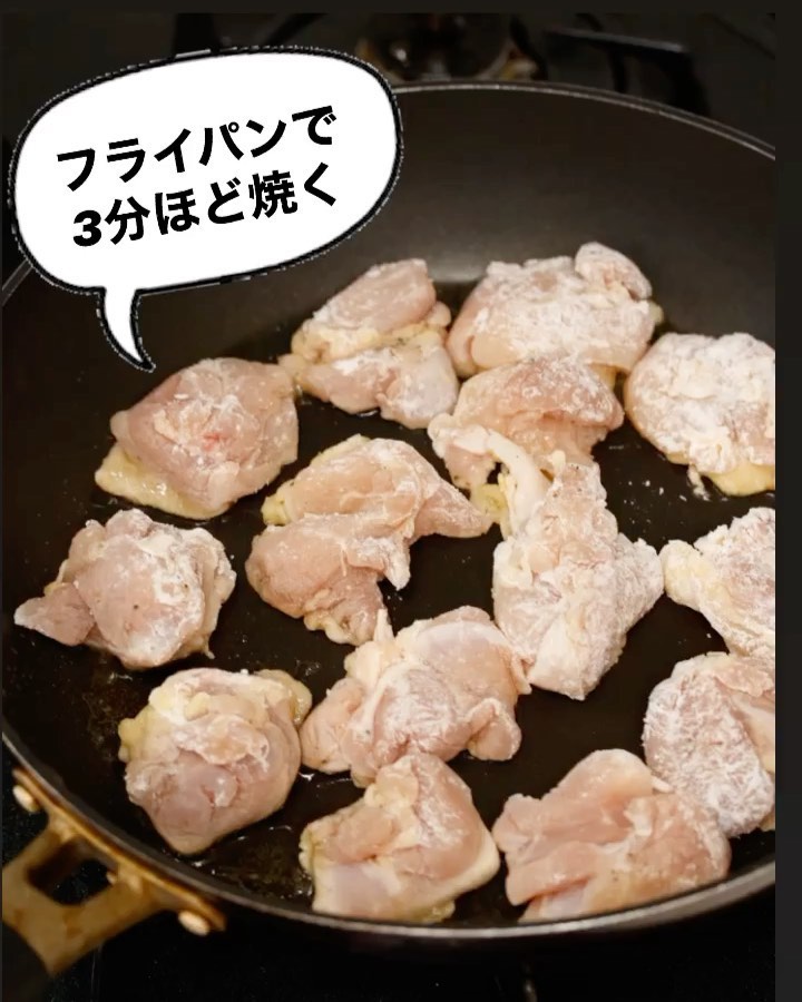 2️⃣フライパンにごま油を中火で熱し、鶏肉を皮目を下にして並べる。3分ほど焼いて裏返し、さらに2分ほど焼く。