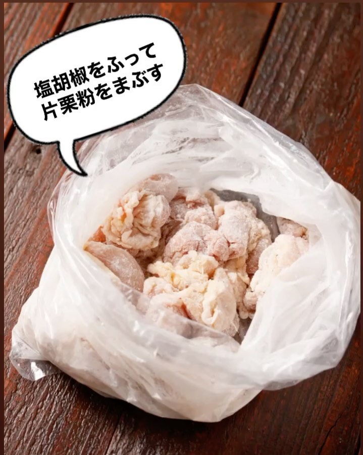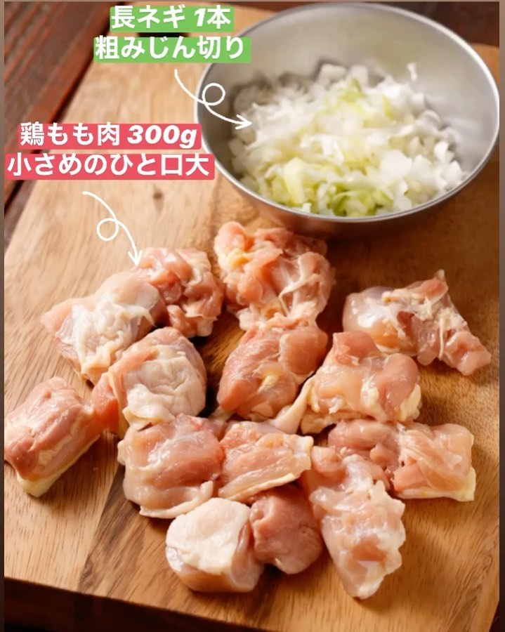 1️⃣鶏肉は小さめのひと口大に切り、塩・こしょうをふって片栗粉をまぶす。長ネギは粗みじん切りにする。
