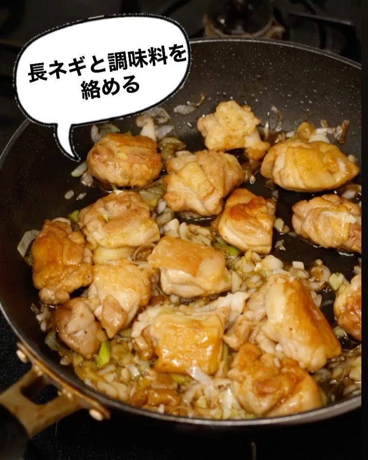 3️⃣鶏肉に火が通ったら、長ネギ・【A】を加えて炒め合わせる。全体に絡んだら完成!