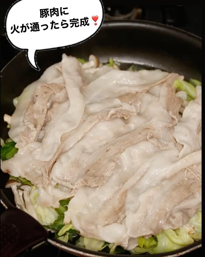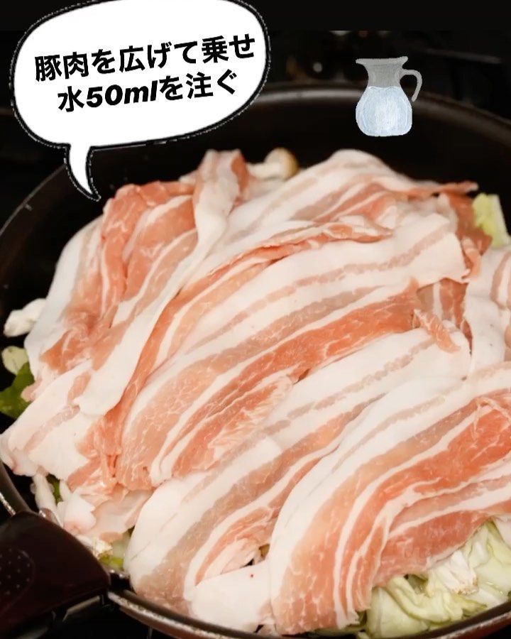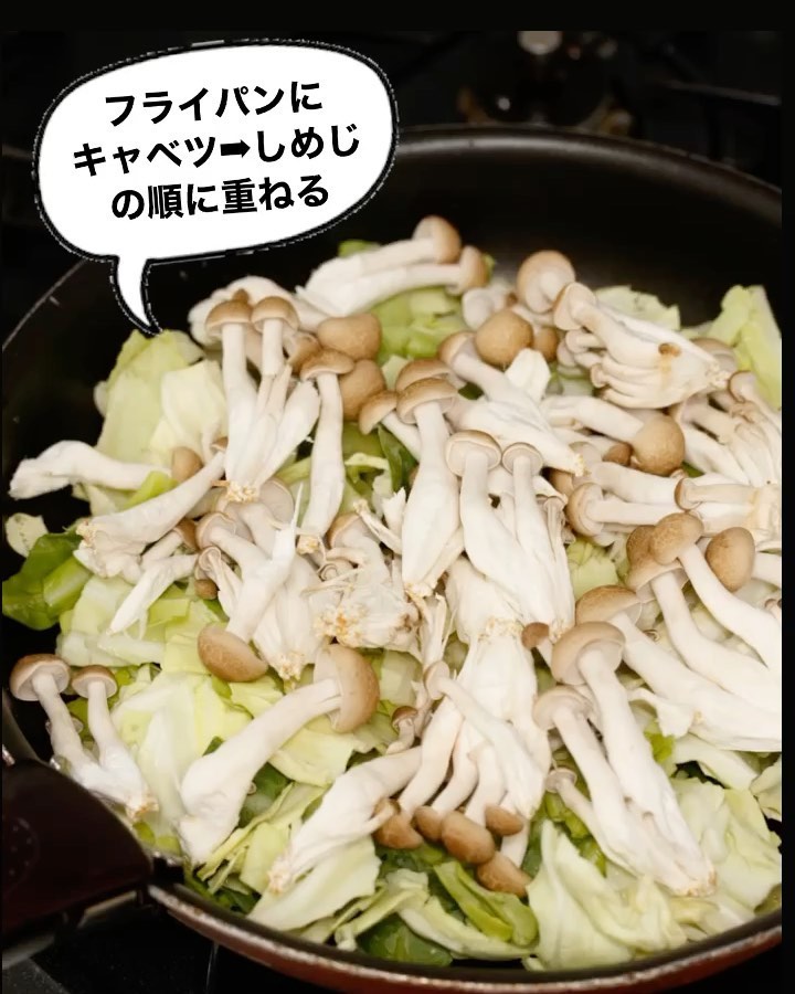 2️⃣フライパンにキャベツ→しめじを重ね、豚肉を広げて乗せる。水50ml(分量外)を回し入れ、蓋をして強火にかける。湯気がたったら中火にし、豚肉の色が変わるまで5分ほど蒸し焼きにする。