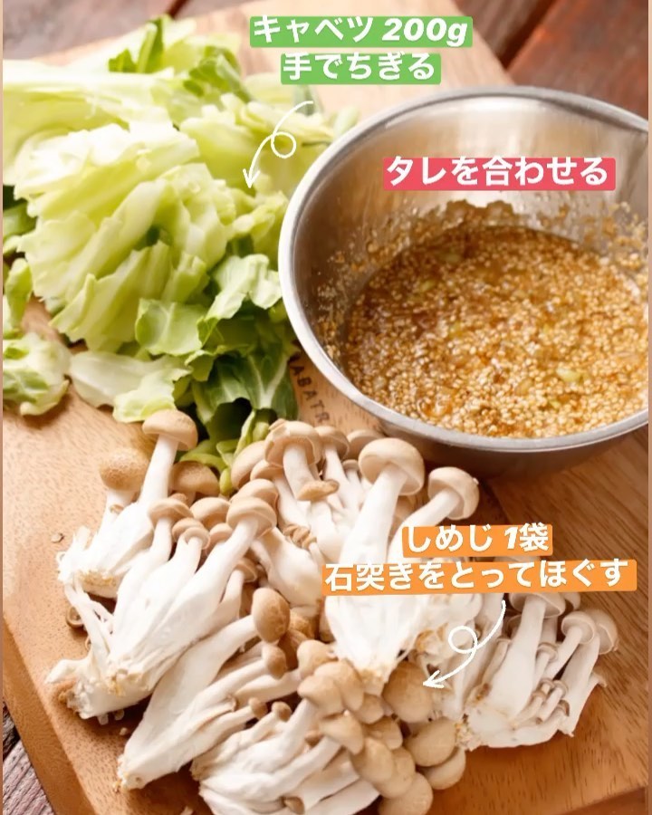 1️⃣キャベツは手でちぎる。しめじは石づきをとってほぐす。【A】は合わせておく。