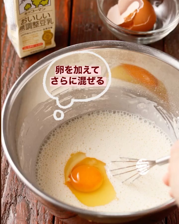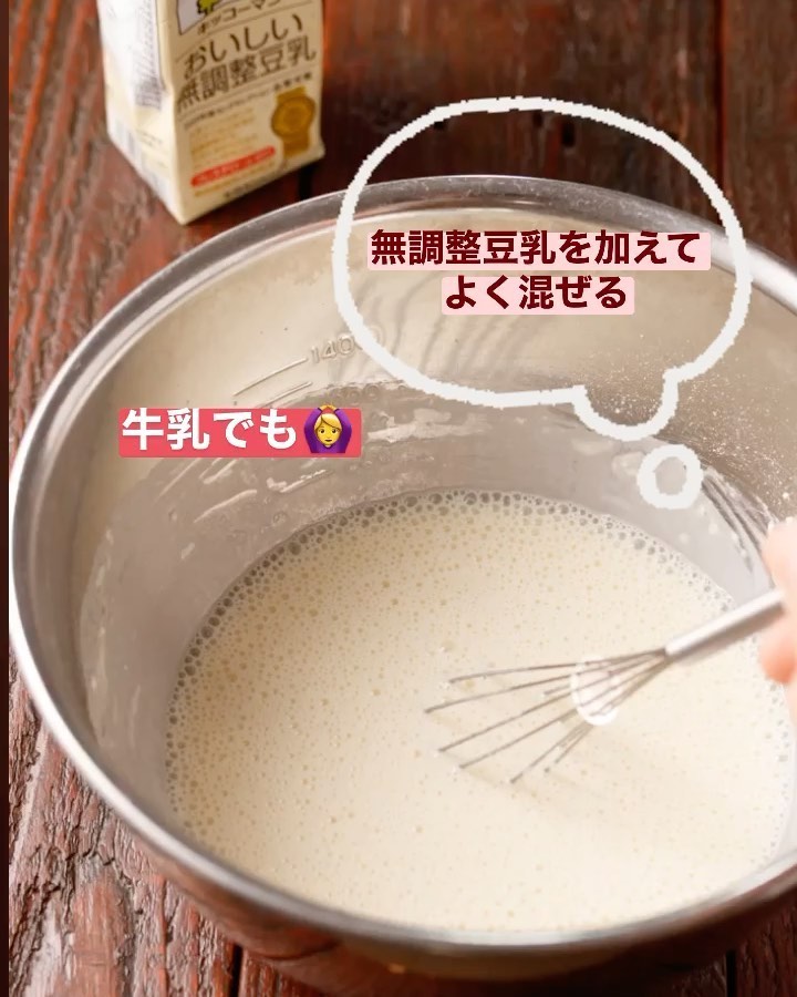 1️⃣ボウルに【A】を合わせて、よく混ぜ合わせる。続いて、無調整豆乳を加えて泡立て器などでよく混ぜ合わせ、粉っぽさがなくなったら卵を加えてさらに混ぜ合わせる。