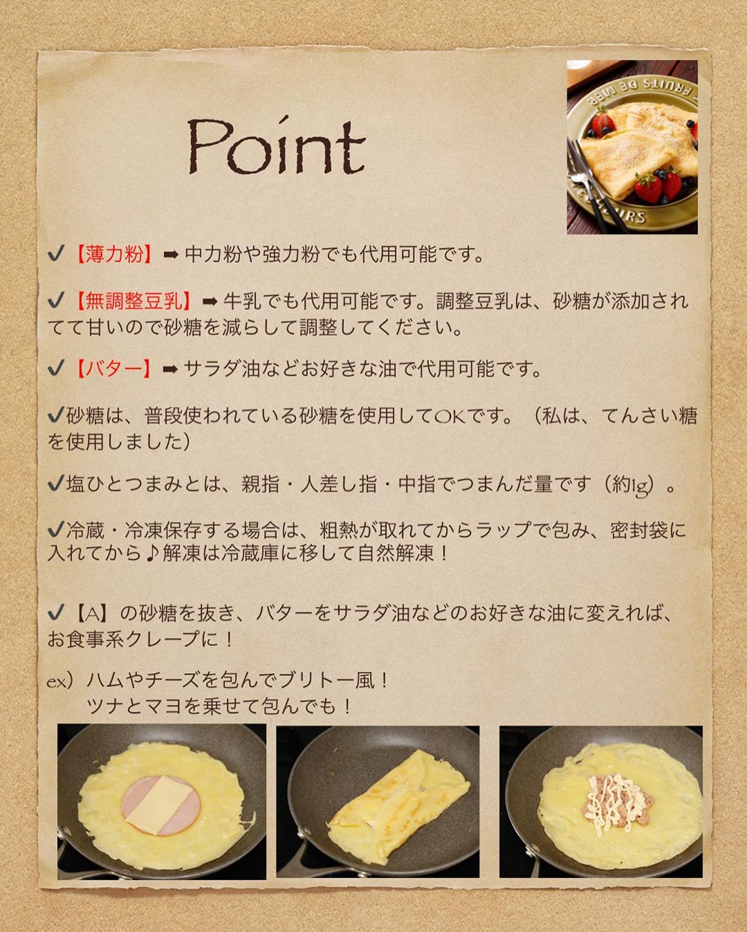 【A】の砂糖を抜き、バターをサラダ油に変えるとお食事系クレープにもなります✨