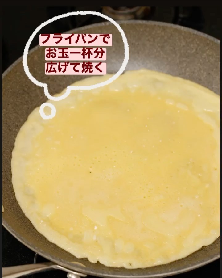 2️⃣フライパンに(直径26cmのもの使用)バター5gを中火で熱し、溶けたら1をお玉1杯分流し入れる。表面が乾き、裏にうっすら焼き色がつくまで焼く。これを残り3回繰り返す。