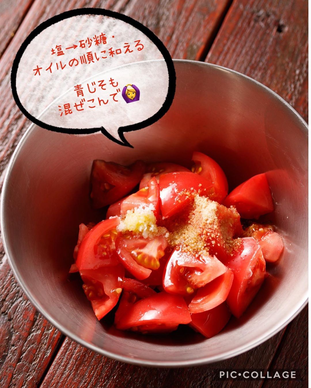 2️⃣ボウルにトマトと塩を入れてよく混ぜ合わせ、塩が馴染んだら【A】と青じそを加えて再度混ぜ合わせる。(写真は見栄えをよくするために、青じそを後乗せしています)