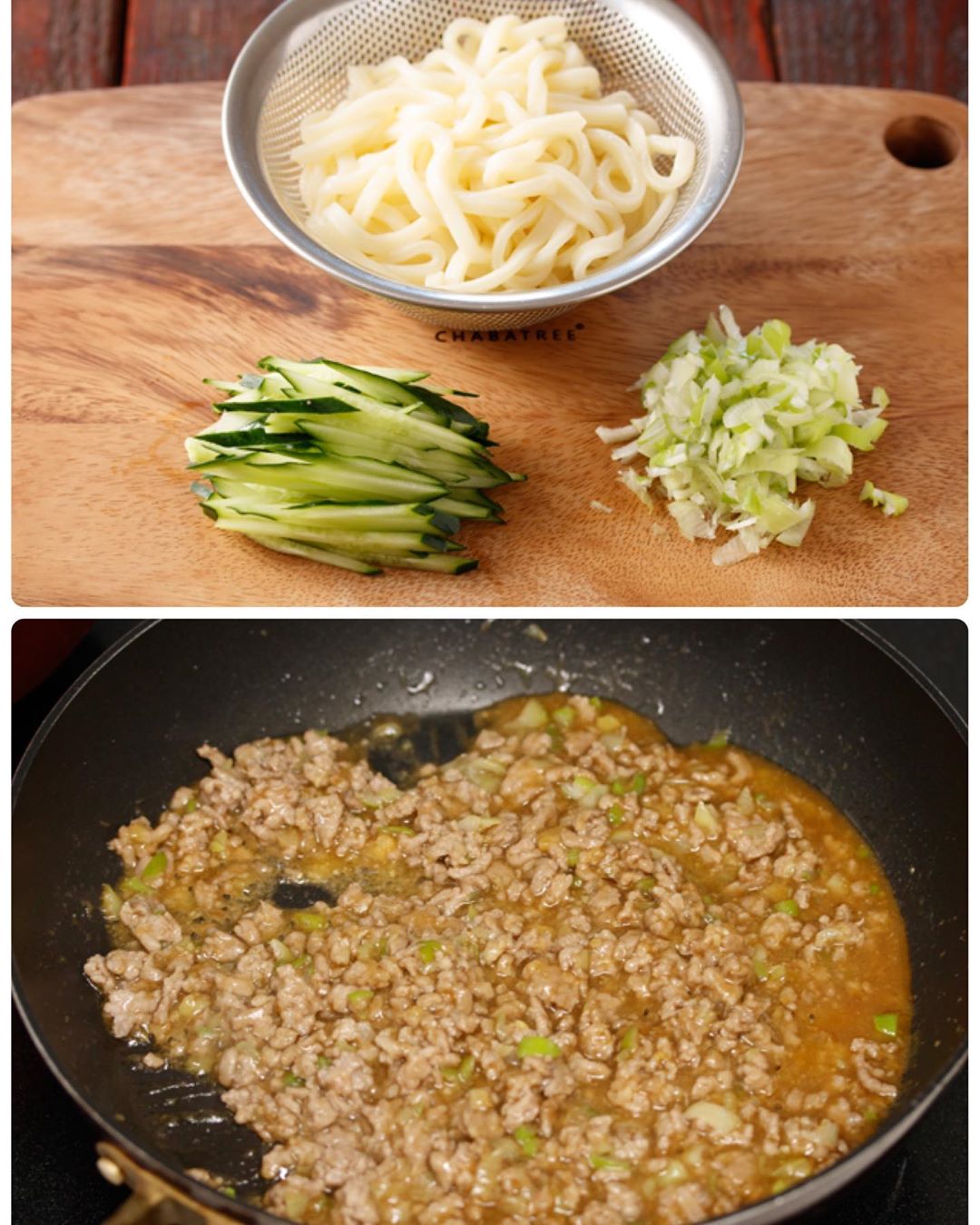 1️⃣冷凍うどんは袋の表示通りにほぐし(レンジor鍋で茹でる)、冷水でしめる。きゅうりは千切りに、長ネギは粗みじん切りにする。