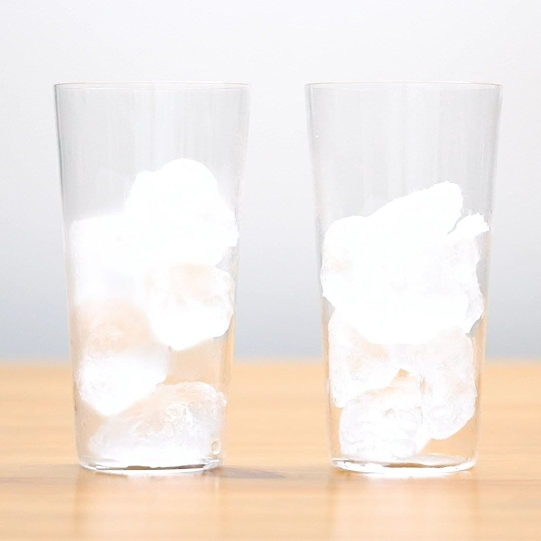 氷は溶ける際にまわりの温度を下げます。塩には氷を早く溶かす性質があるため、氷に混ぜることで急激に温度が下がり、0度以下になってジュースがシャーベット状になります。お好みのジュースでお試しください。とても冷たくなるのでタオルなどを当て、素手で触らないようにしてください。