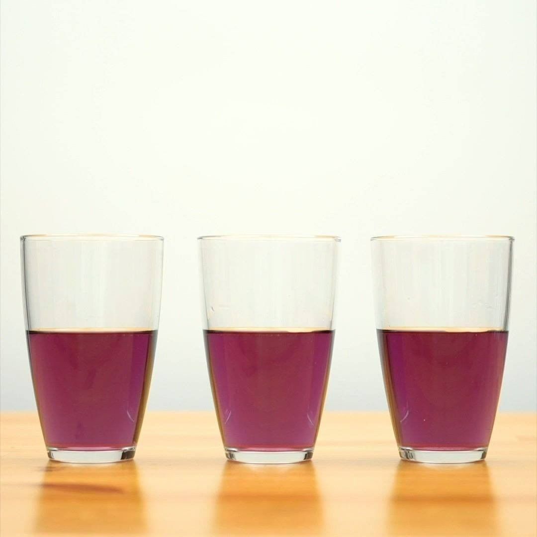 1. 計量カップにマロウブルーを入れ、水を注いで10分おきます。鮮やかな青色になったら、茶こしで濾しながら透明なグラスに三等分に分けます。