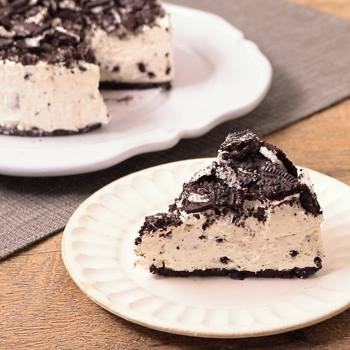 オーブンなしで作れる、さくふわなクッキークリームのチーズケーキの紹介です。おやつやデザートにはもちろん、華やかに仕上がるので、おもてなしスイーツやイベント時にもぴったりです。手軽な材料で作れるのでぜひ、お試しくださいね。
