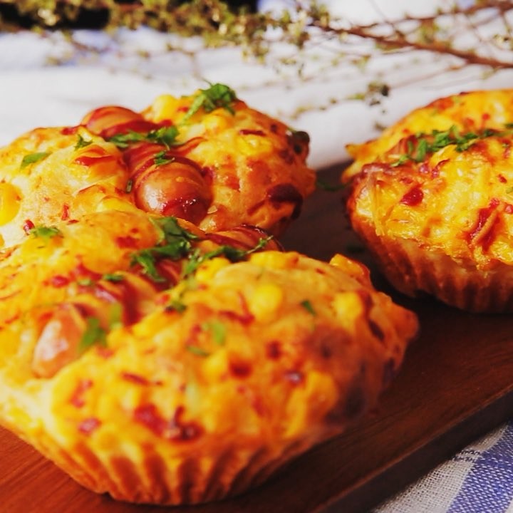 2. アルミカップに①を流し入れる。上にマヨネーズと和えたコーンをかけ、ウィンナーを乗せる。ケチャップとマスタードをかけたら、オーブン180度で20分焼く。