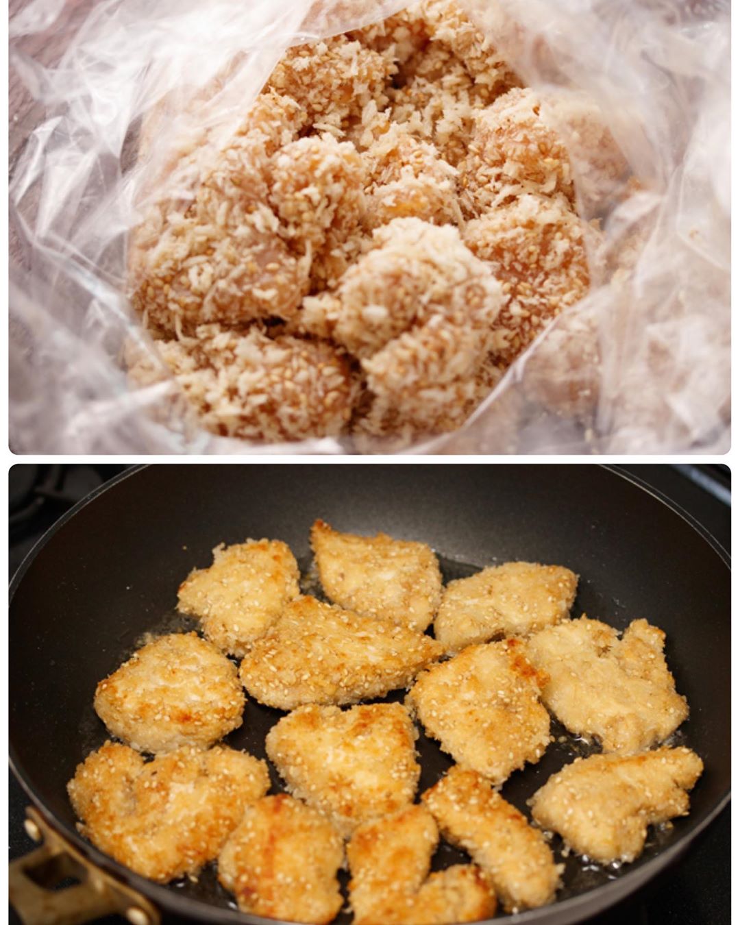 2️⃣ポリ袋(またはバット)に【B】を合わせ、軽く汁気を切った1を入れてまぶす。(口を閉じて上下にふると◎)